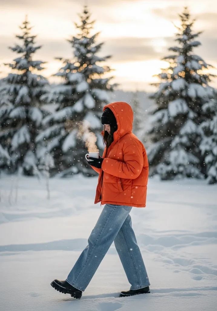 Pair the look with chunky boots or winter-ready footwear, and add a beanie for extra warmth. This outfit is perfect for winter outings or casual strolls in the snow.