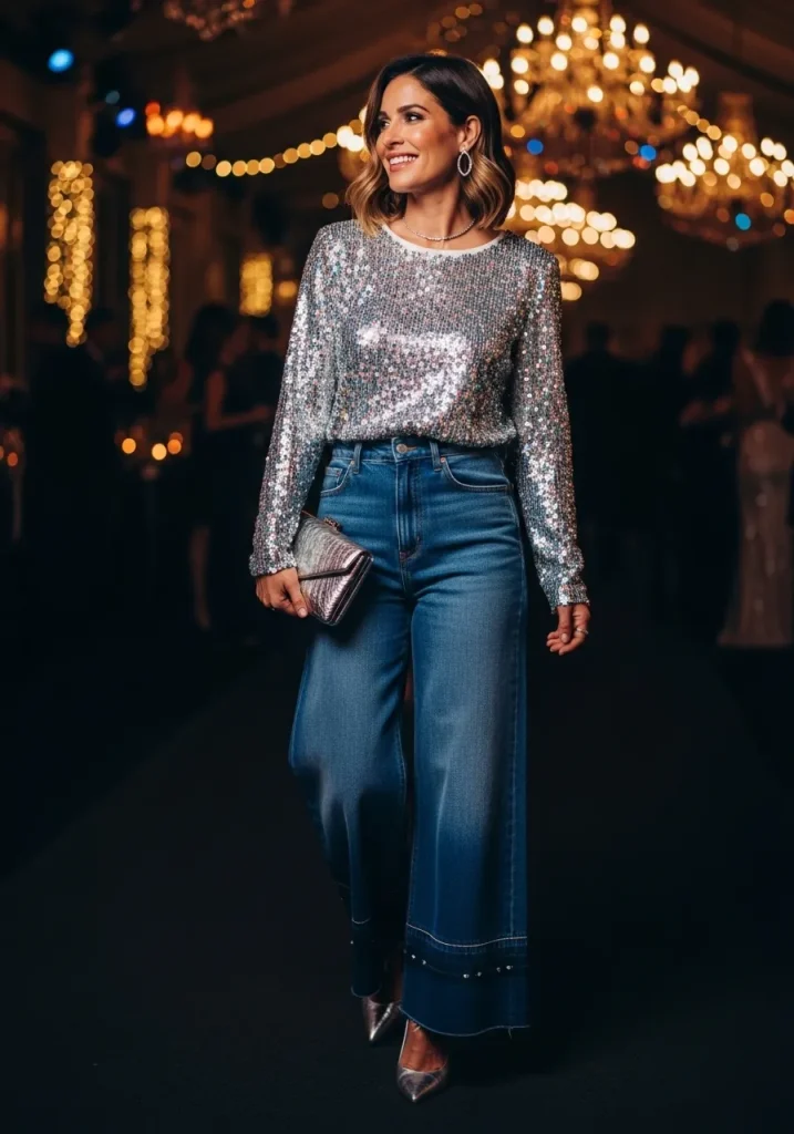 Add a touch of sparkle to your wide-leg jeans with a shimmering sequin top. This unexpected pairing takes the glamour of the sequin top and balances it out with the casual vibe of the wide-leg jeans, creating a chic, party-ready look. Whether you choose a simple sequin crop top or a more elaborate design, this combination is sure to turn heads.