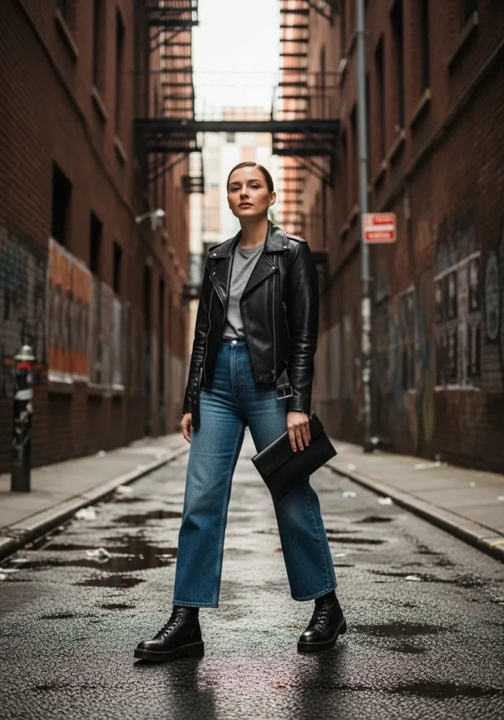A leather jacket adds an edgy twist to any outfit, and when paired with wide-leg jeans, it creates a perfect balance of tough and trendy. The wide-leg jeans soften the sharpness of the leather, while the jacket adds a bold statement to the look. Choose a classic black leather jacket for timeless style or a colored version for a more modern flair.