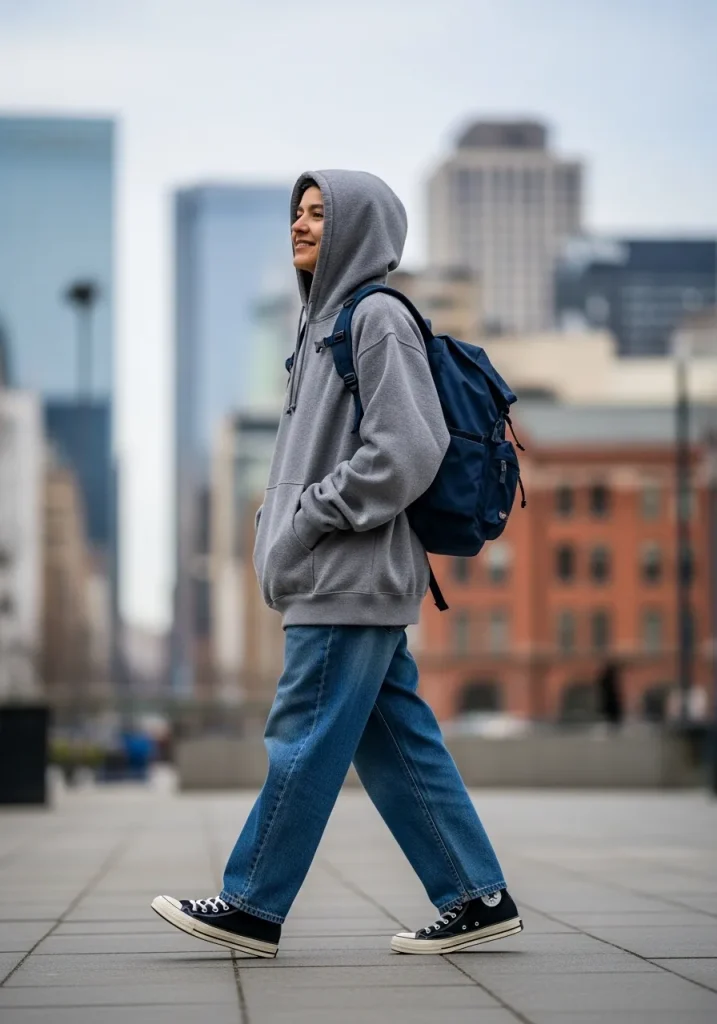 Complete the look with classic Converse sneakers or any casual footwear of your choice. Whether you’re exploring the outdoors or lounging with friends, this outfit is both stylish and cozy.