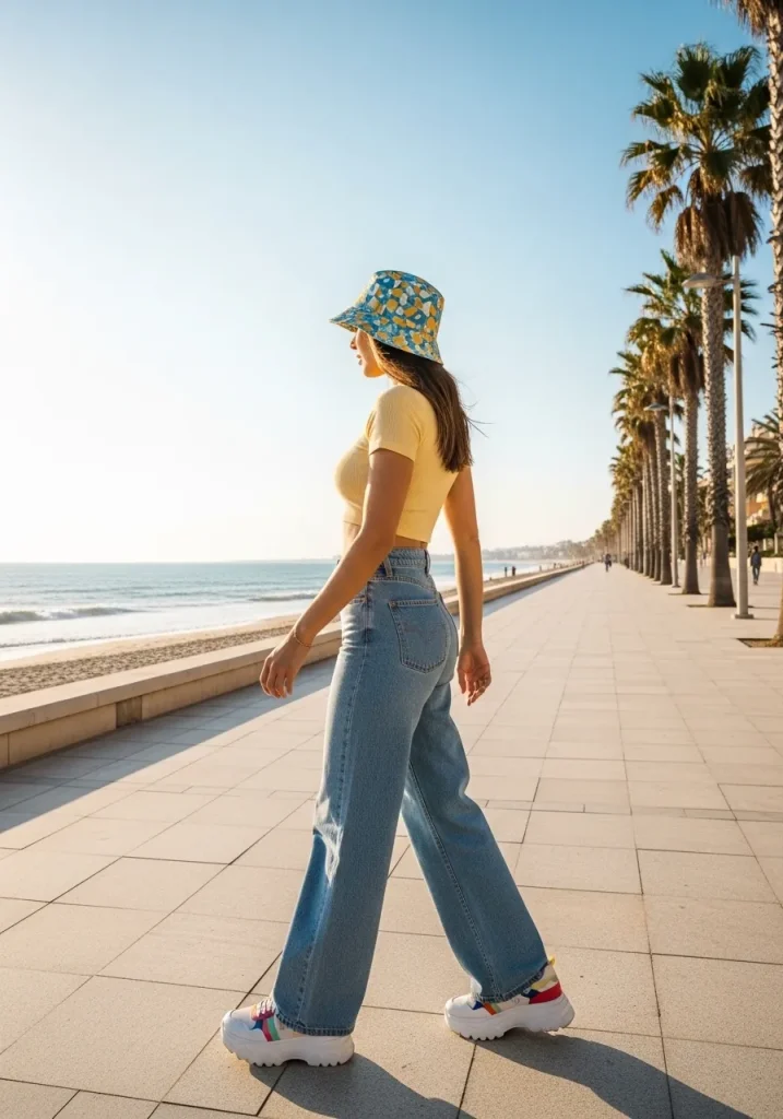 Pair with sneakers or platform shoes for a laid-back, everyday look, and add accessories like a bucket hat or sunglasses for a fun touch. This is a perfect outfit for beach trips, park outings, or casual brunches.