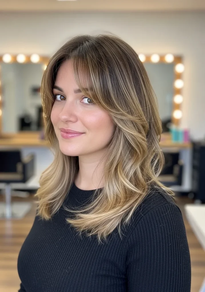 Curtain bangs paired with long layers create a soft and face-framing look that feels incredibly flattering. The bangs gently open around the face, adding dimension and softness without feeling heavy. This style works especially well for adding balance to fuller face shapes. It feels elegant and trendy at the same time.