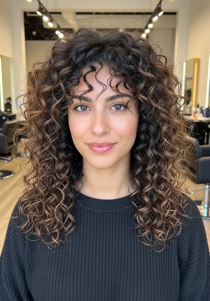 Use curl-enhancing products to define and hydrate your curls. The layers allow movement and bounce, making the style look dynamic. This look works beautifully for both casual and dressed-up occasions. This haircut feels confident and vibrant.