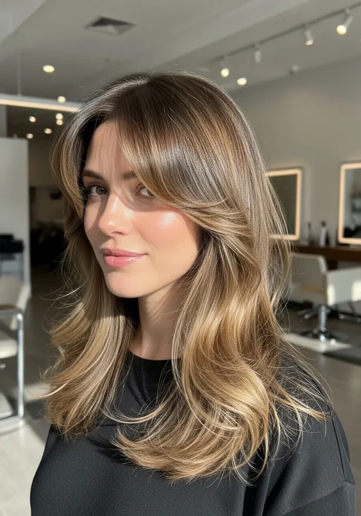 Side-swept bangs paired with layered hair create a soft and flattering look that frames the face beautifully. The angled bangs add movement and draw attention to your features. It’s a great option if you want to add dimension without a dramatic change. This haircut feels elegant and balanced.