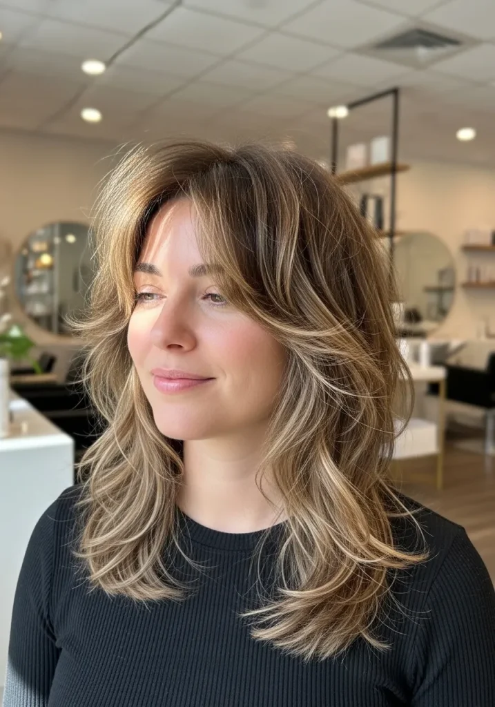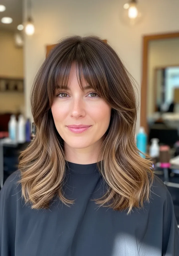 You can style this haircut with loose waves or a smooth blowout depending on your mood. The medium length keeps it easy to manage while still offering versatility. Wispy bangs are low-maintenance and grow out beautifully over time. This haircut feels relaxed, flattering, and easy to wear.