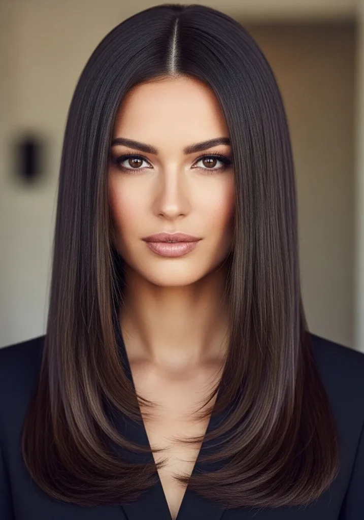 Sleek straight long hair is a timeless option that always looks polished and elegant. The length creates a flowing silhouette while the smooth texture keeps the look refined. It’s perfect for those who love classic styles with a modern touch. This haircut feels sophisticated and feminine.